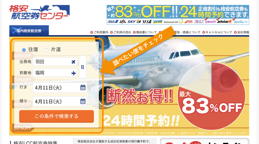 トップページの格安航空券検索から、「出発地」「到着地」「行きのご搭乗日」「帰りのご搭乗日」を選び、「検索」ボタンをクリックして下さい。