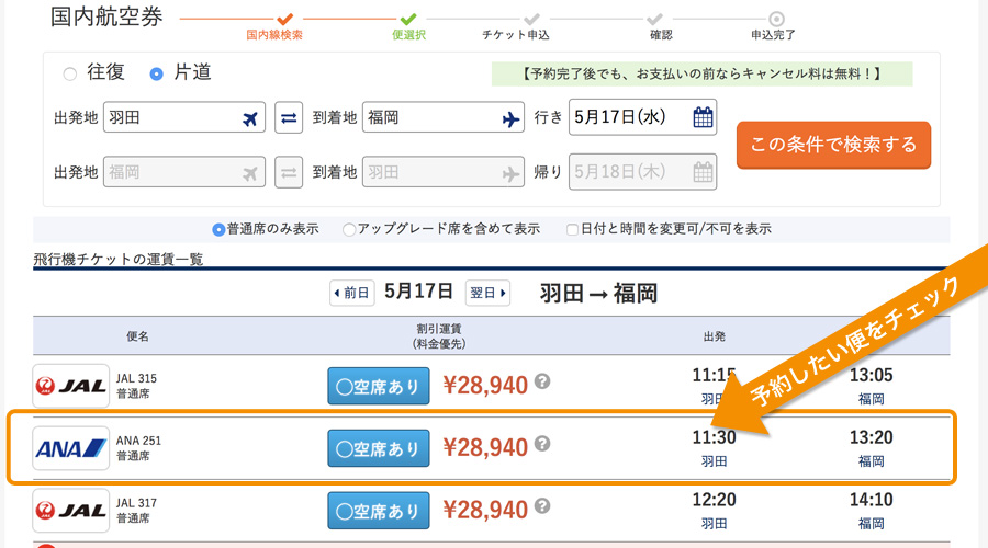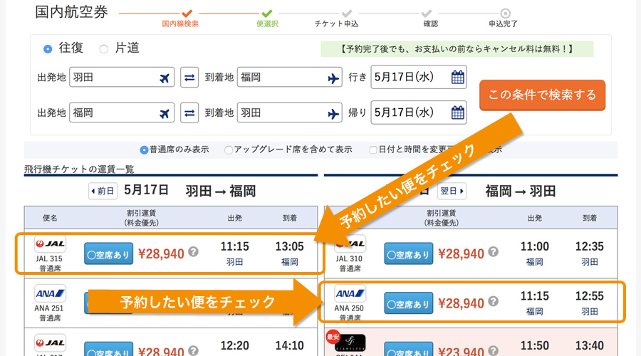 フライトスケジュールの料金表示上にある料金でご希望の航空券をご選択ください。